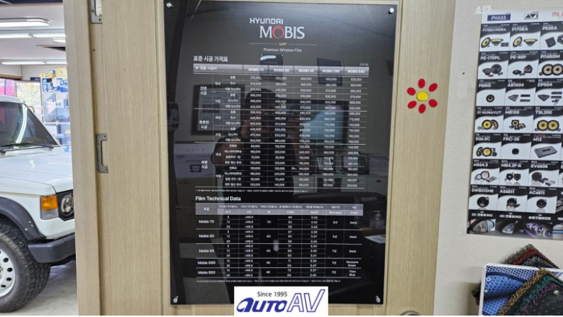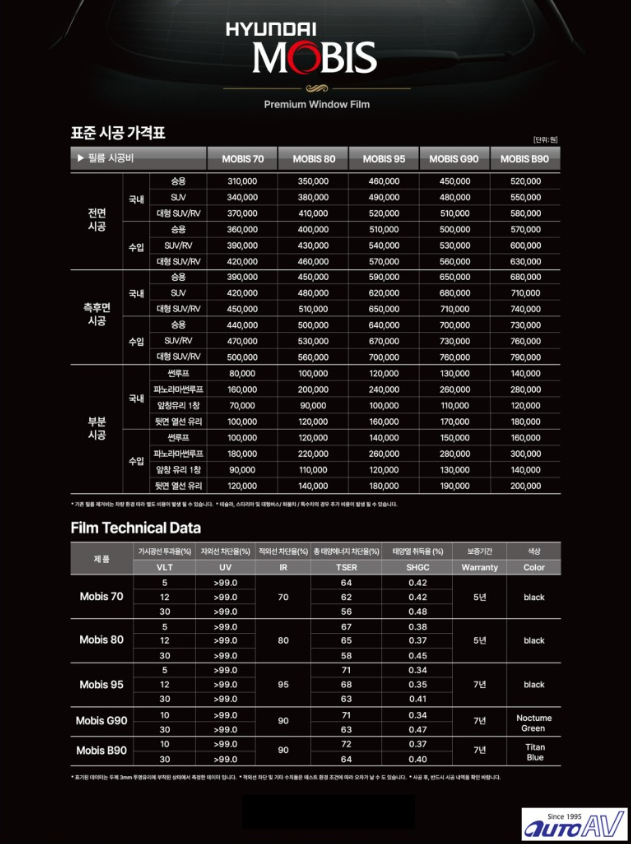 현대 모비스 프리미엄 틴트 필름 시공 가격표입니다.