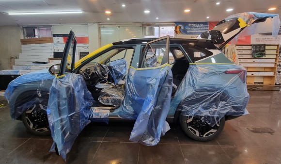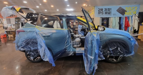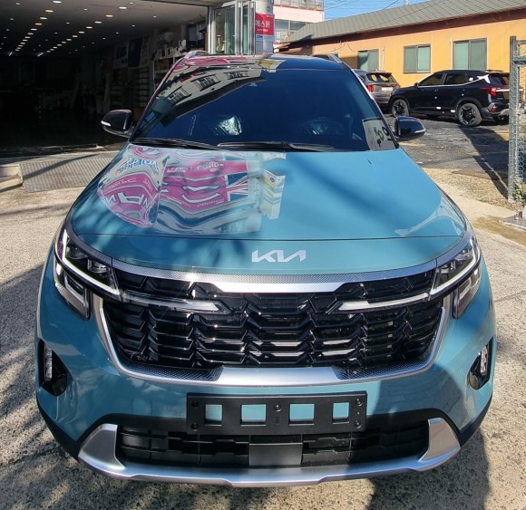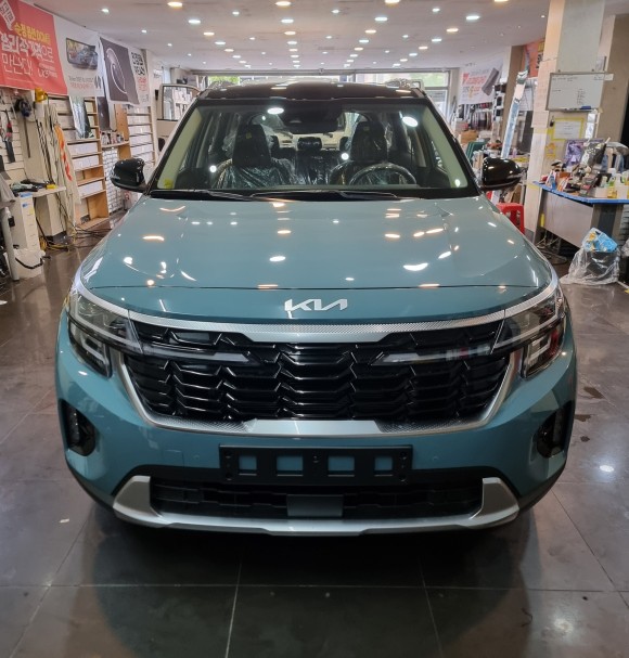 플루톤블루 컬러의 셀토스 차량이 썬팅시공을 위해